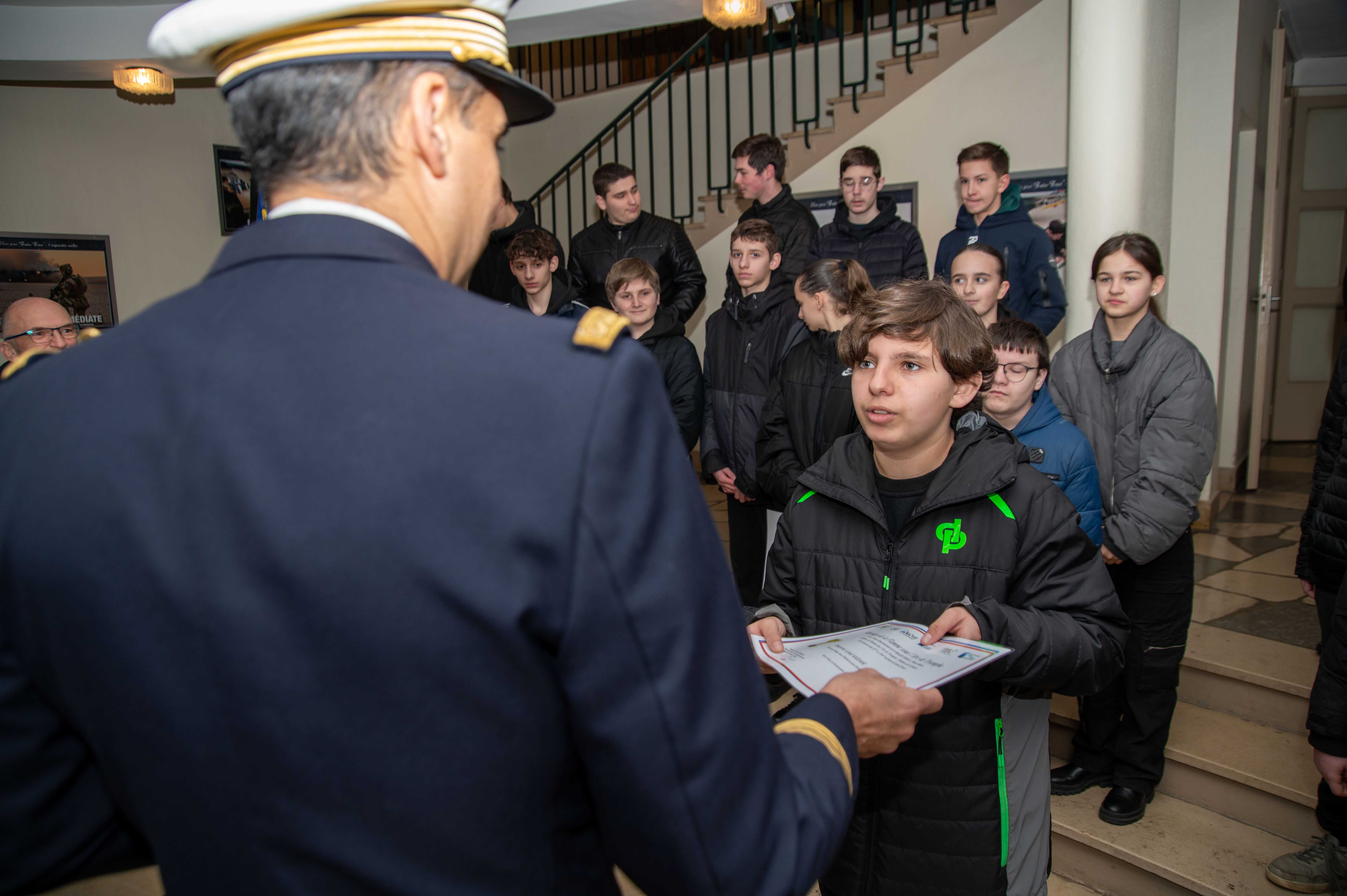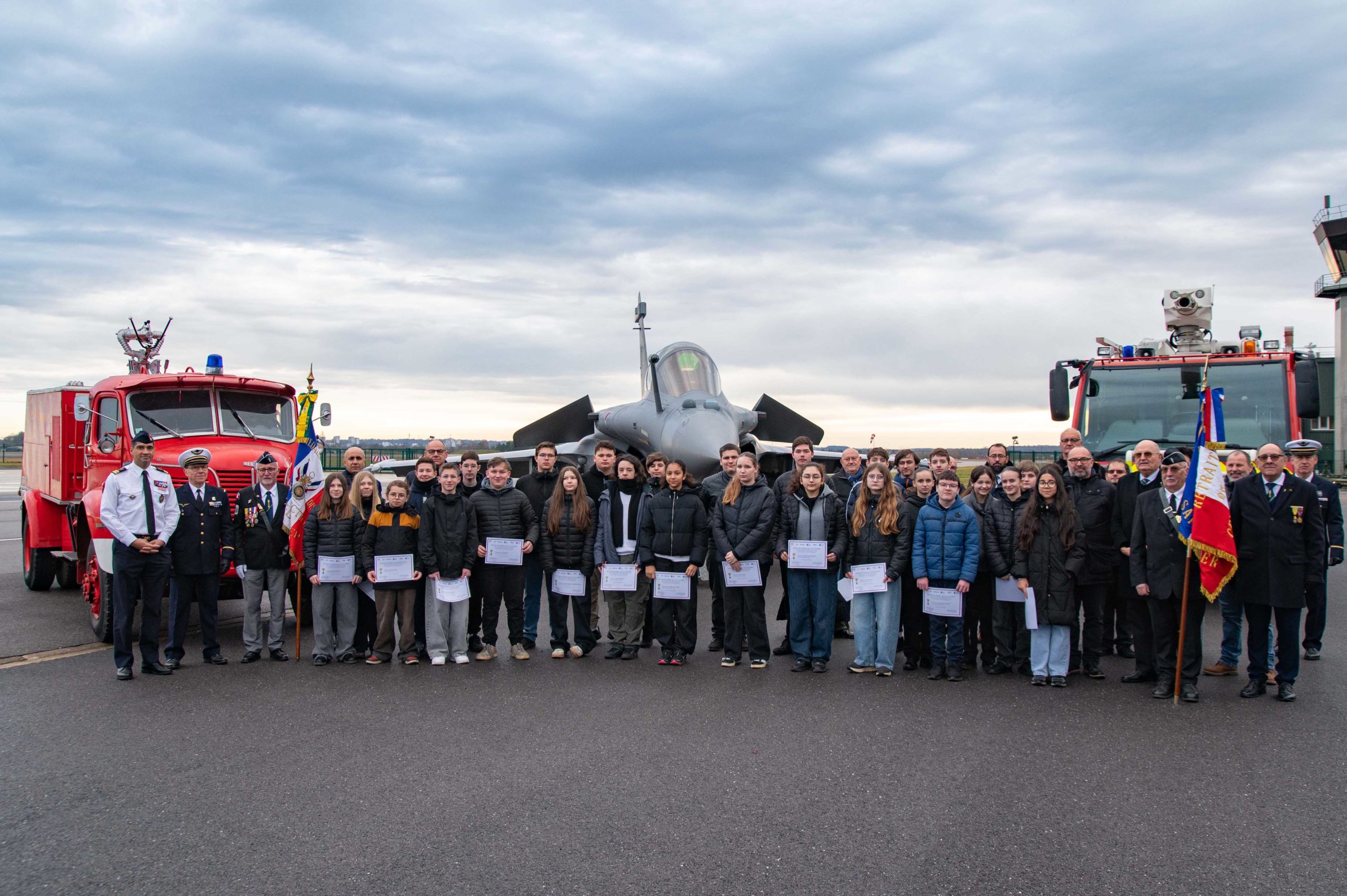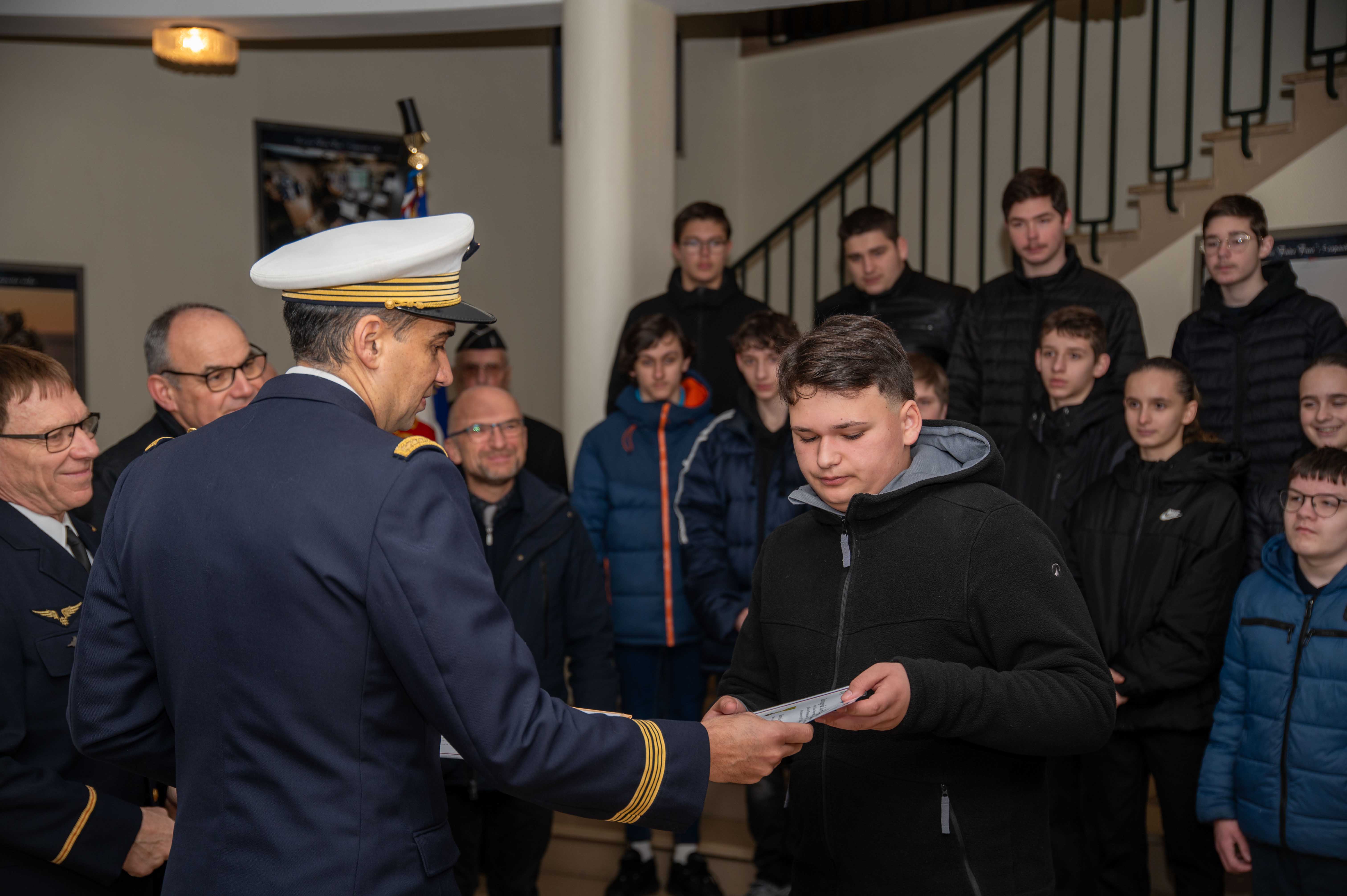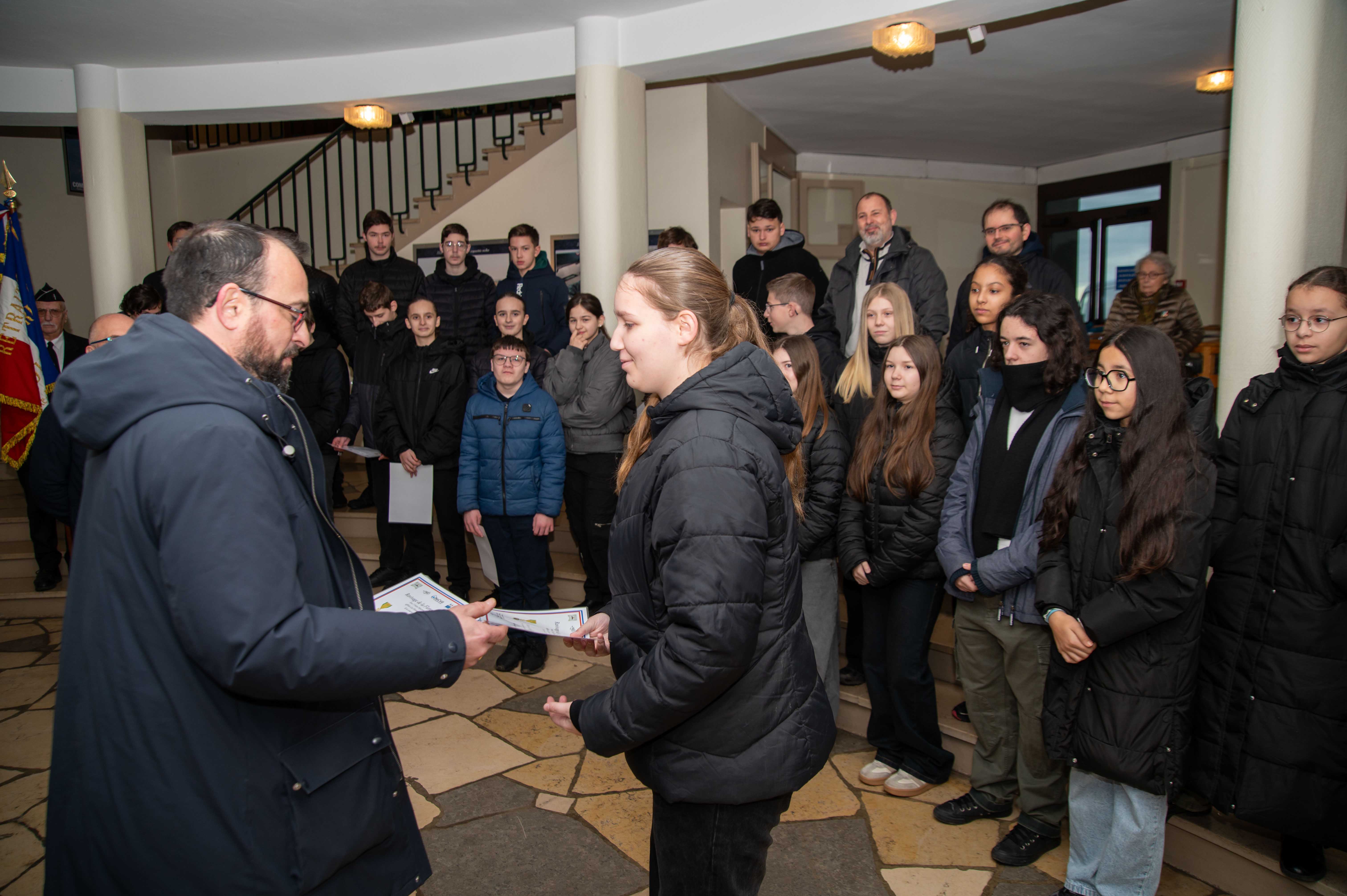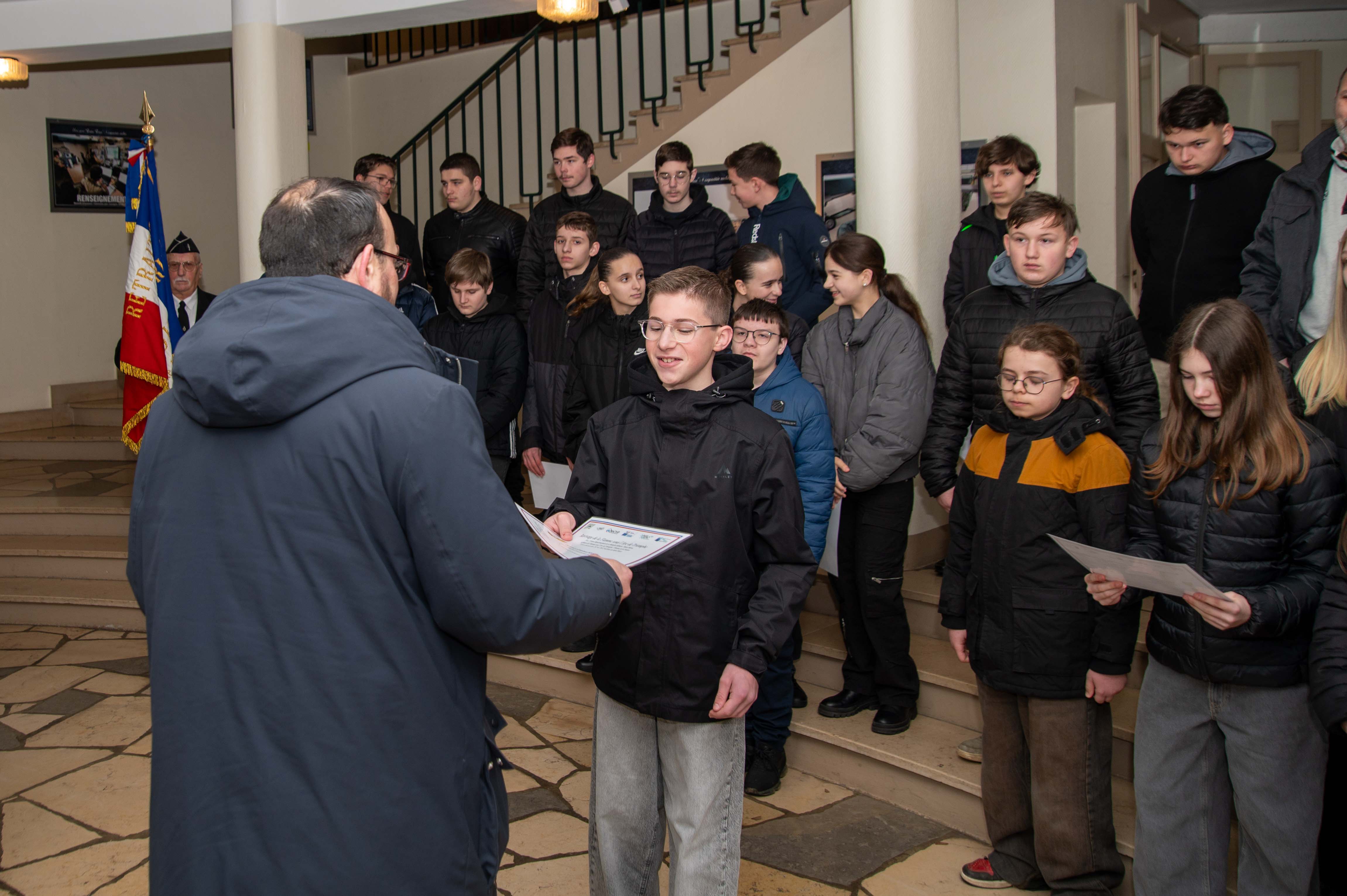 En effet, les élèves du collège Anne FRANK de cette ville encadrés de leurs professeurs, ont reçu des mains du colonel PONIN BALLOM commandant la base ,ainsi que du directeur de l’ONAC/VG , Mr MERCIER et du président de la 1844° section l’ADC (R) S BROUSSARD, leur diplôme attestant de leur participation à la cérémonie de ravivage de la Flamme sacrée, sous l’arc de triomphe à Paris le 4 décembre 2025.Etaient présent également, Mr JP PAQUET président départemental MM UD52, Mr D DURAND président 287° section de St Dizier avec son drapeau porté par Mr F FRISER.