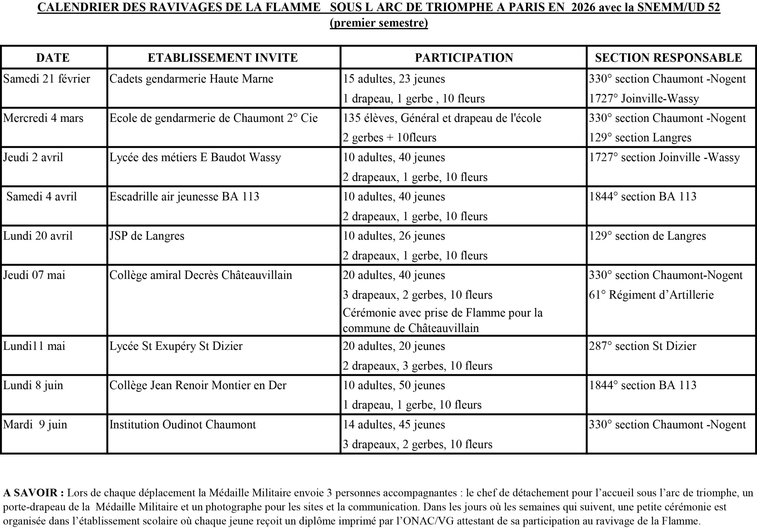 Planification des ravivages de la Flamme 2026